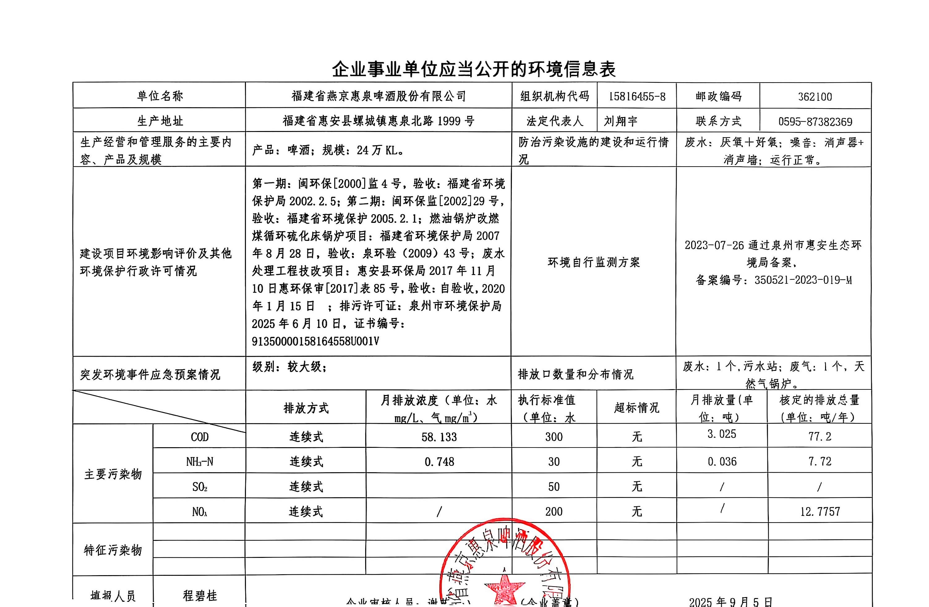 福建省燕京惠泉啤酒公司2025年9月环境信息表