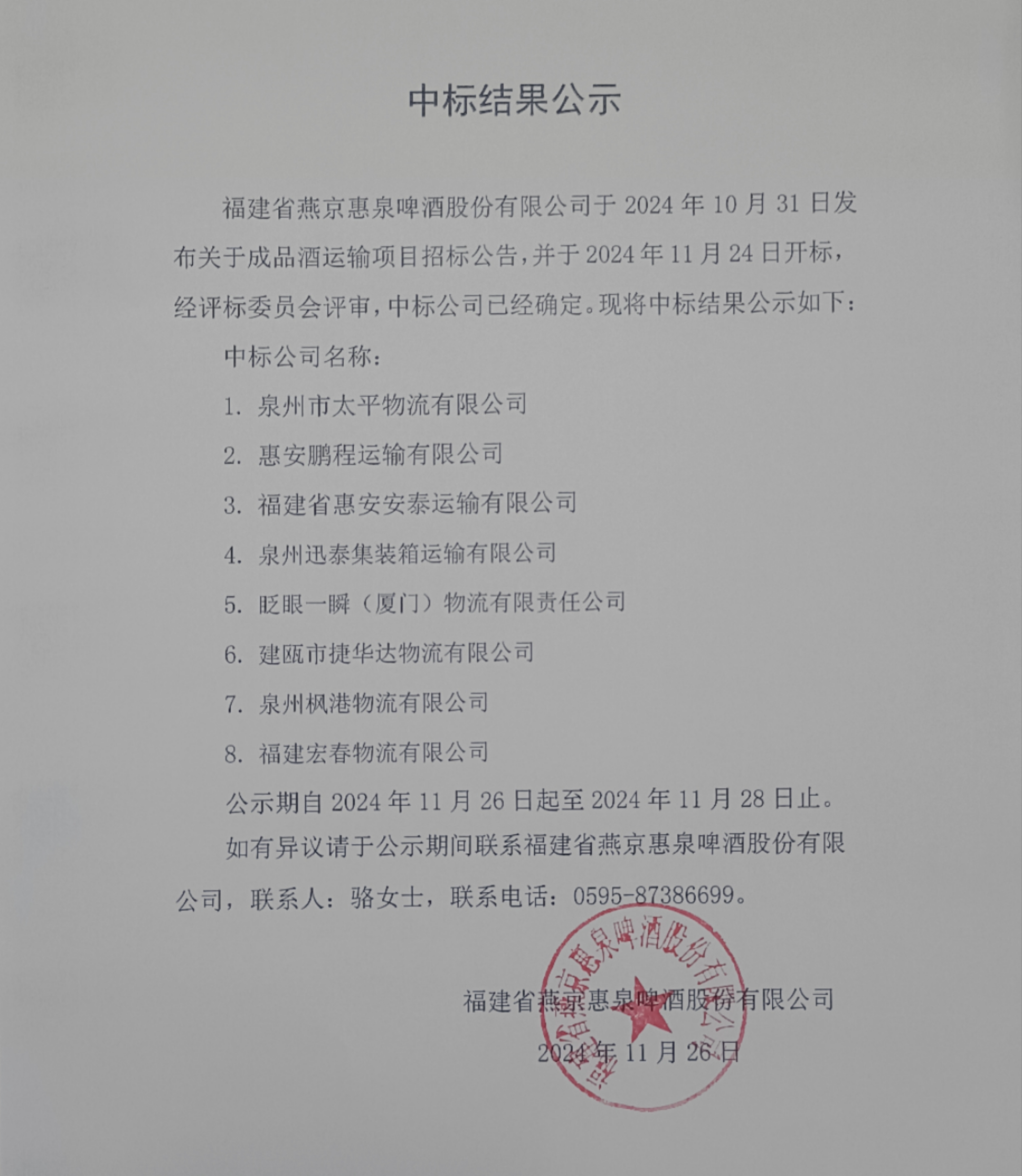 :福建省燕京惠泉啤酒股份有限公司 部份废品招标公告