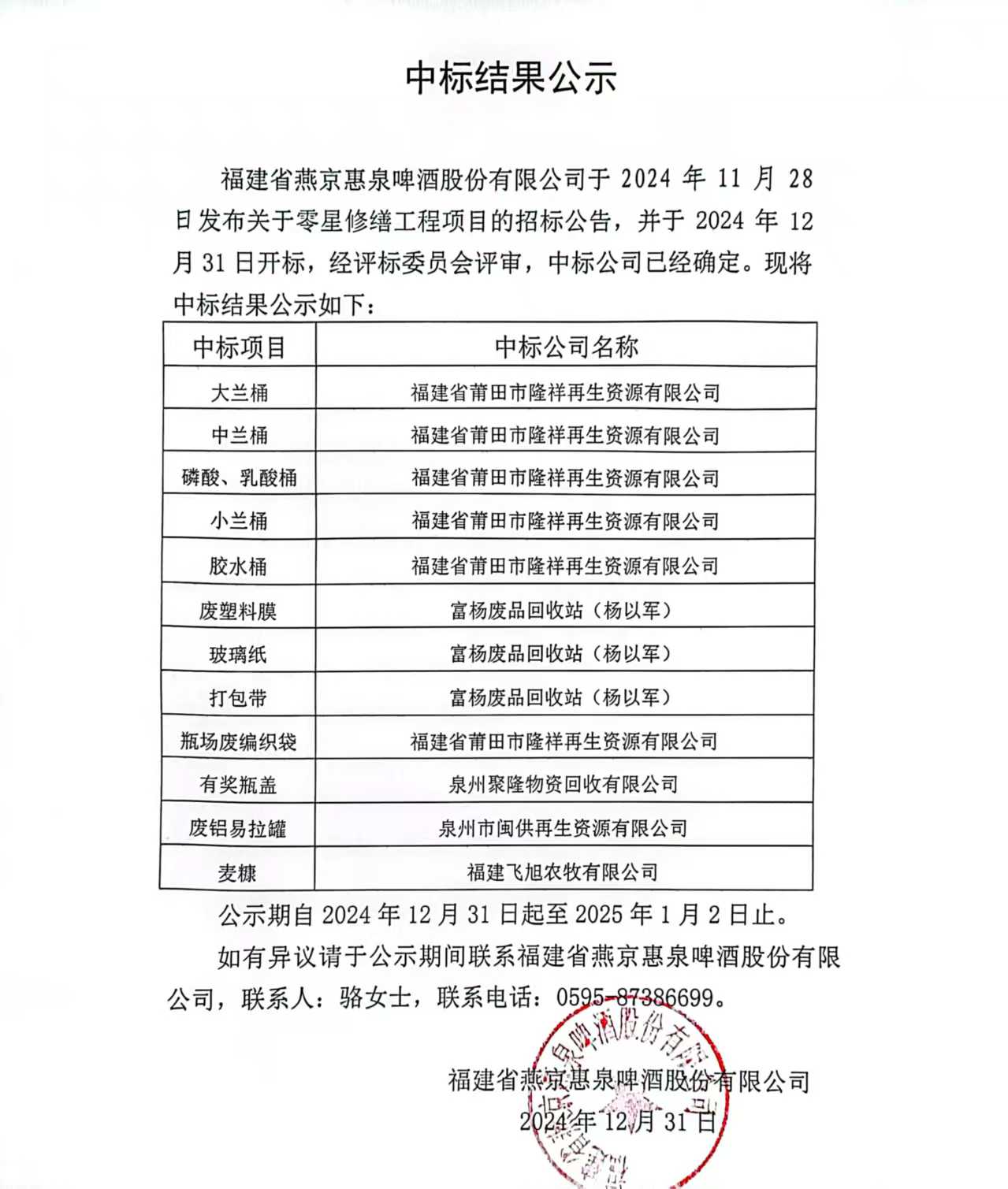 :福建省燕京惠泉啤酒股份有限公司 基建工程项目招标公告