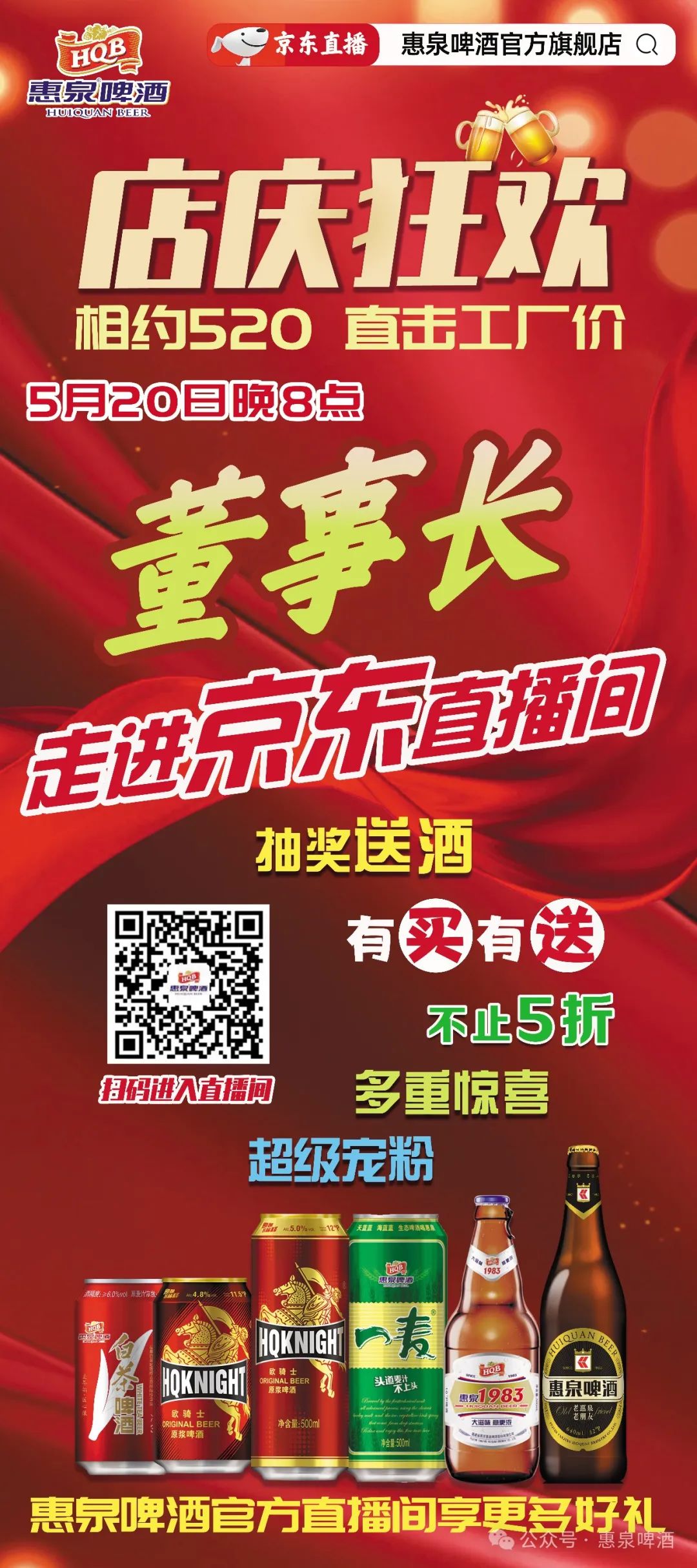 520是电商大节,也是惠泉啤酒京东旗舰店店庆之日。5月20日晚8点,惠泉啤酒公司董事长将走进京东直播间与粉丝们热情互动,分享品牌故事,亲自为大家展示和介绍旗舰店的各惠泉啤酒产品,同时带来多重惊喜,送礼、抽奖,当然少不了《春Se寄情人》陈麦Dong一人独酌时饮用的同款啤酒——500ml惠泉一麦啤酒,将为这个甜蜜的节日增添一份别样的精彩。期待您的到来!