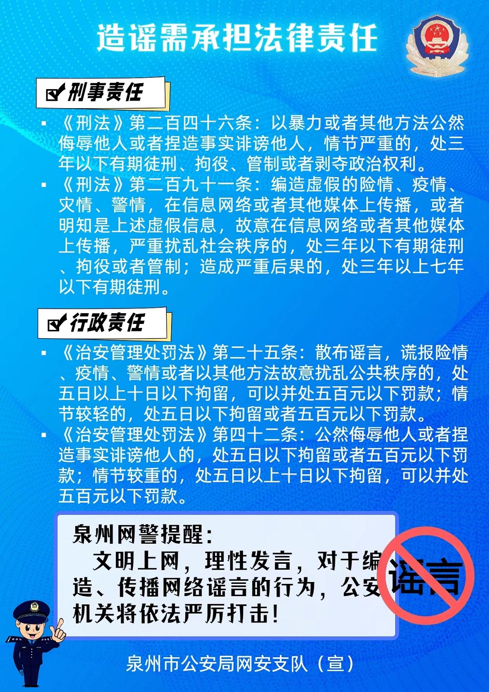 “惠安公安提醒您 请依法依规上网坚持做到不造谣、不传谣、不信谣”。