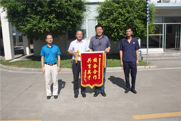 惠安一中校长周锦忠代表学校向公司赠送“校企合作、共育英才”锦旗。