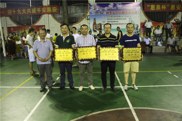 由惠安县委直属工委、惠安县文体新局主办、燕京惠泉公司党委承办、惠安县篮球协会、泉州市三好体育发展有限公司协办的惠安县县机关庆七·一、迎十九大“惠泉杯”男子篮球赛于7月20日晚在县工人俱乐部灯光球场圆满落幕!本次“惠泉杯”18支党委机关代表队历时22天、经过44场激烈的角逐,公安代表队战胜政府代表队获得本次杯赛的冠军,政府、教育、供电分获二到四名,经信、泉惠、市政、法院名列五至八名。县级相关领导和燕京惠泉公司的几位领导莅临决赛现场,观赏了精彩激烈的最后对决,并在赛后为获奖的代表队以及个人颁发了奖牌、奖品和奖金。